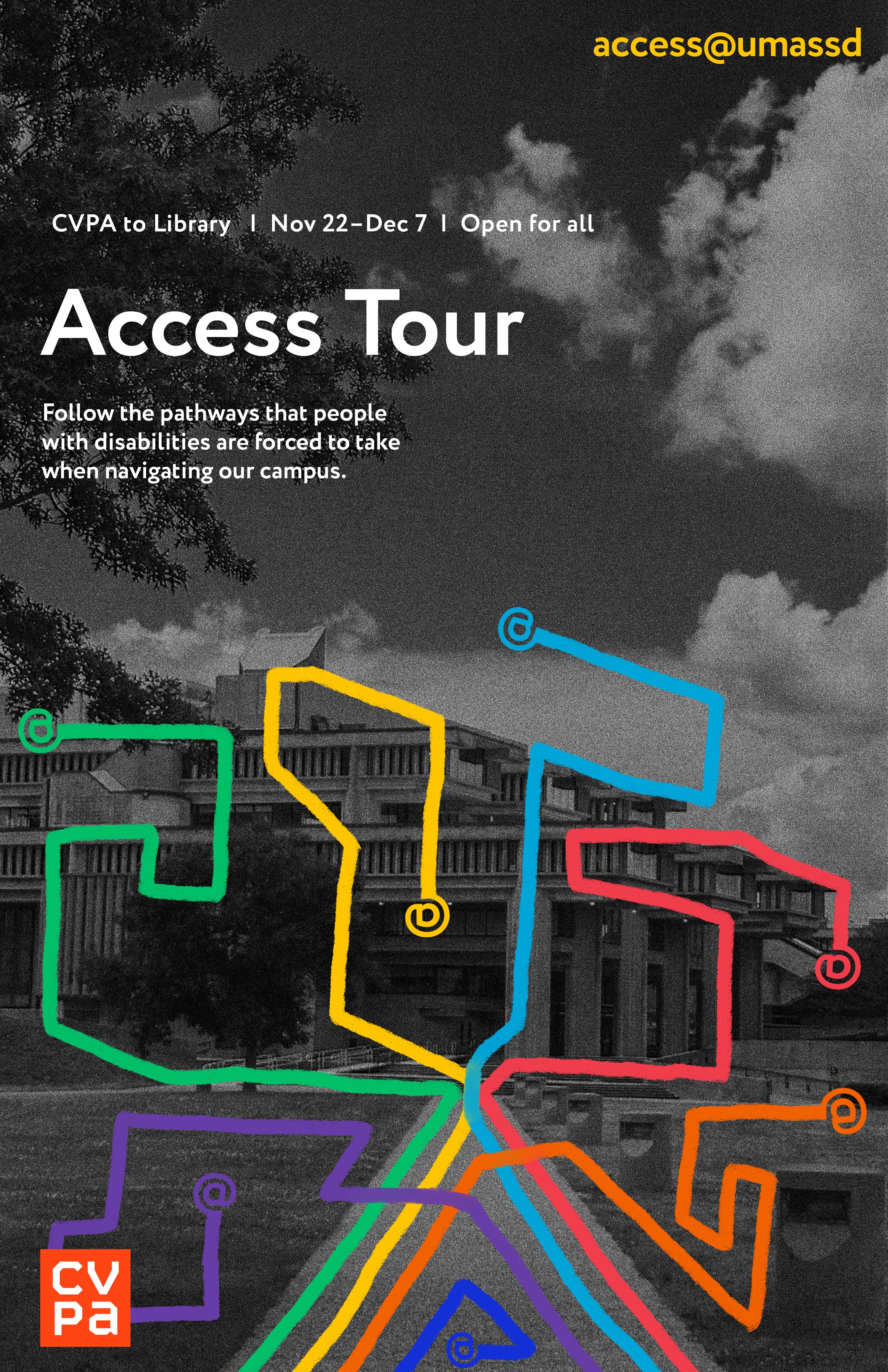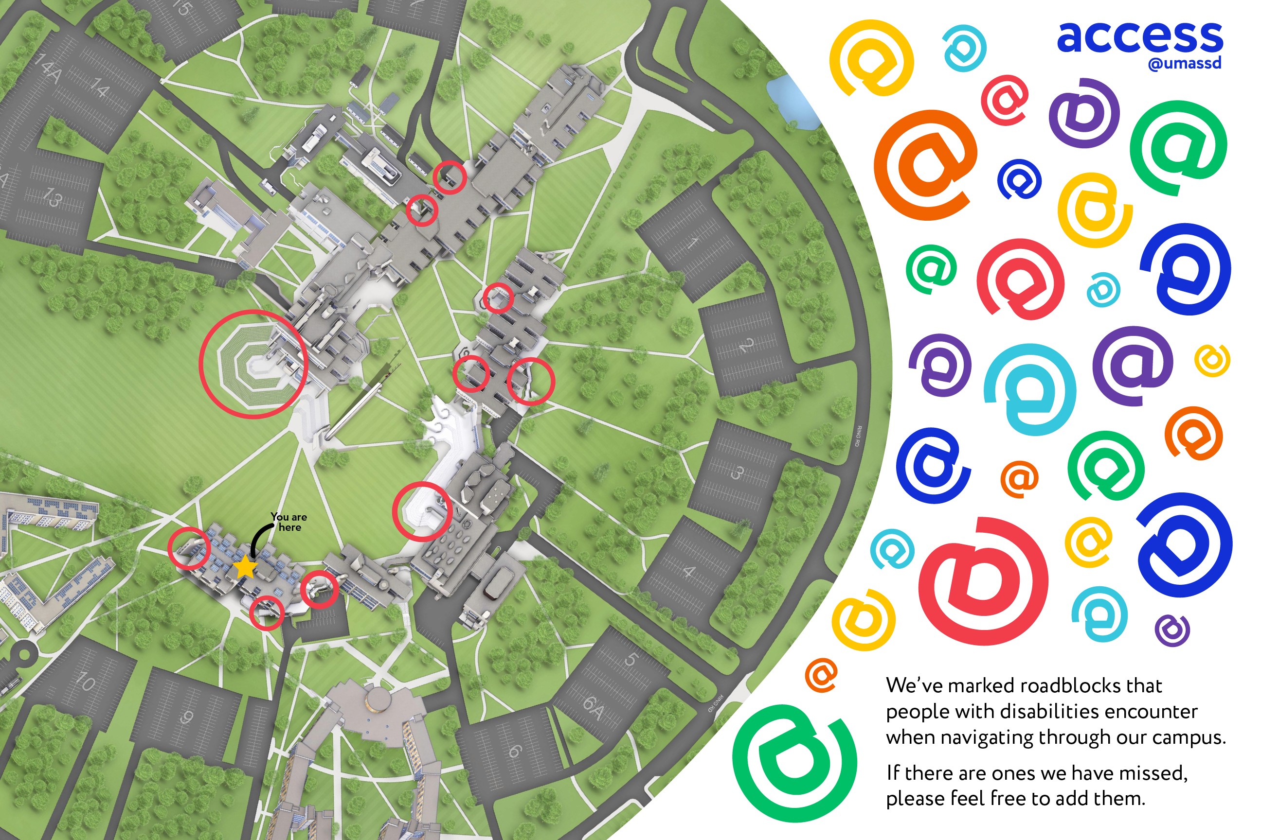 While UMass Dartmouth’s brutalist architecture is beautiful, it is also needlessly inaccessible. In the Fall of 2022 Eden McKenna-Bateman and I set out on an independent study focused on addressing universal design and the accessibility issues that plague our campus. Combining our different skills, Eden worked on art historical research and curation, while I worked on branding, identity, and advertising for our collaborative project, access@umassd.