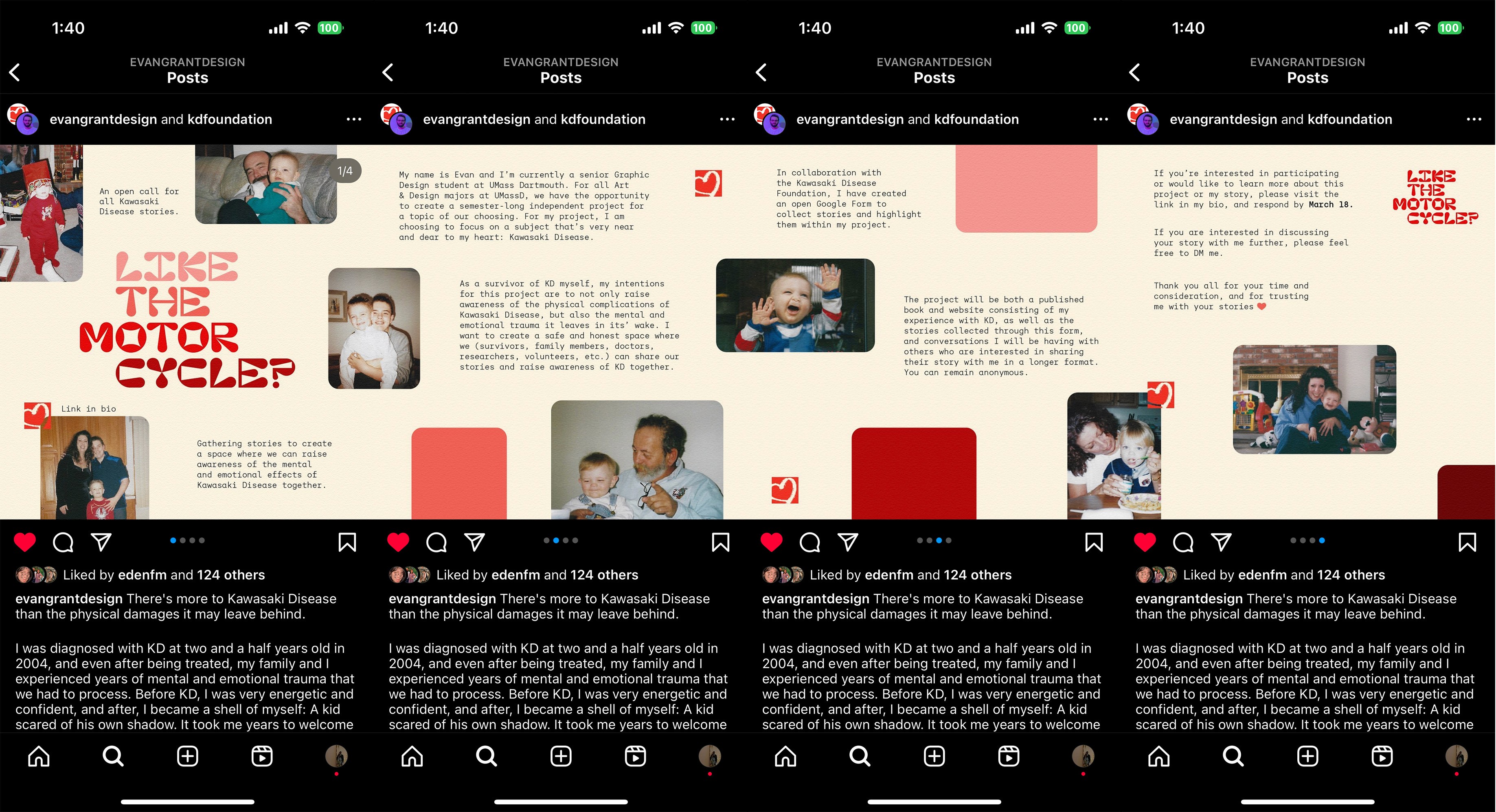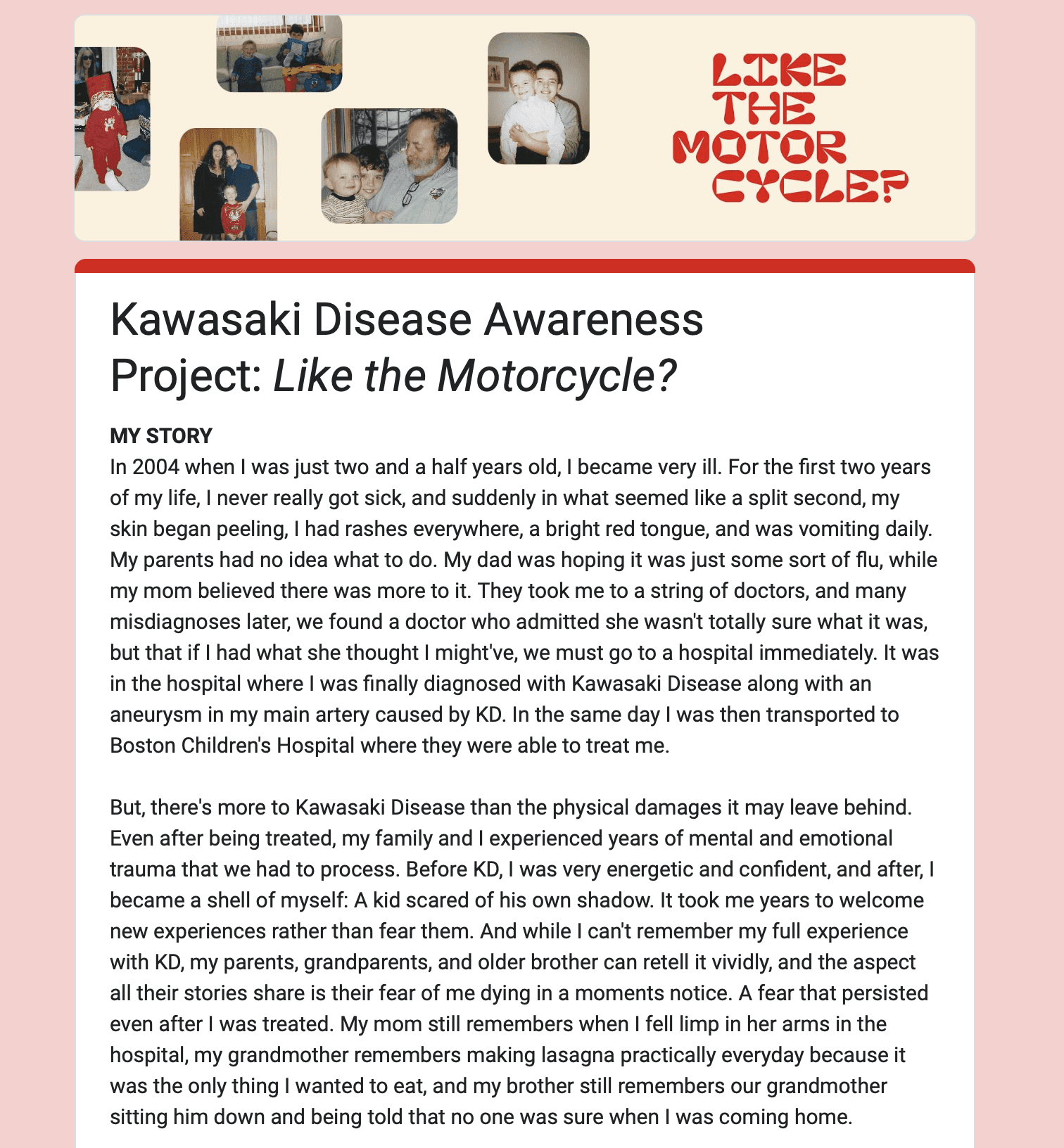 Originally conceptualized for my senior capstone project, Like the Motorcycle? is an ongoing project created to raise awareness of Kawasaki disease, and the mental and emotional trauma it leaves in its' wake. It currently consists of over 40 Kawasaki disease stories and conversations.
